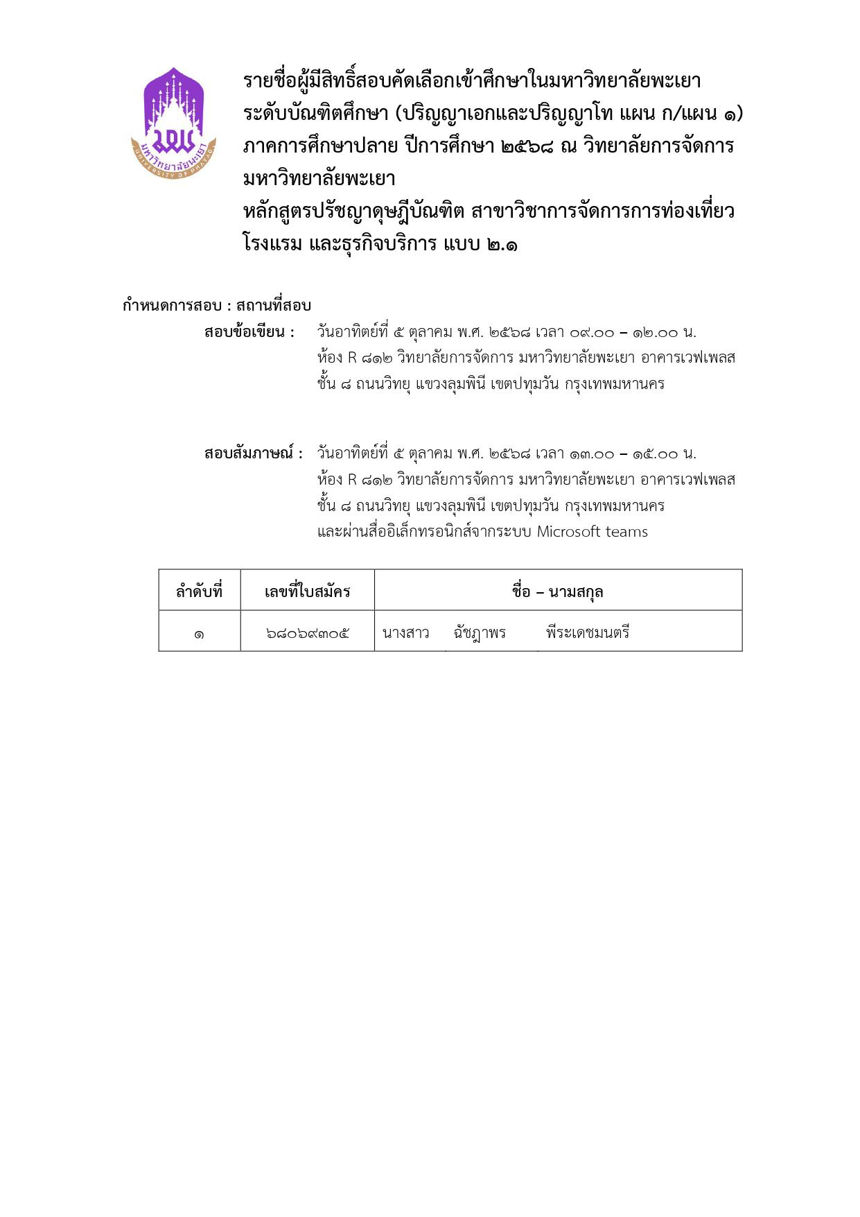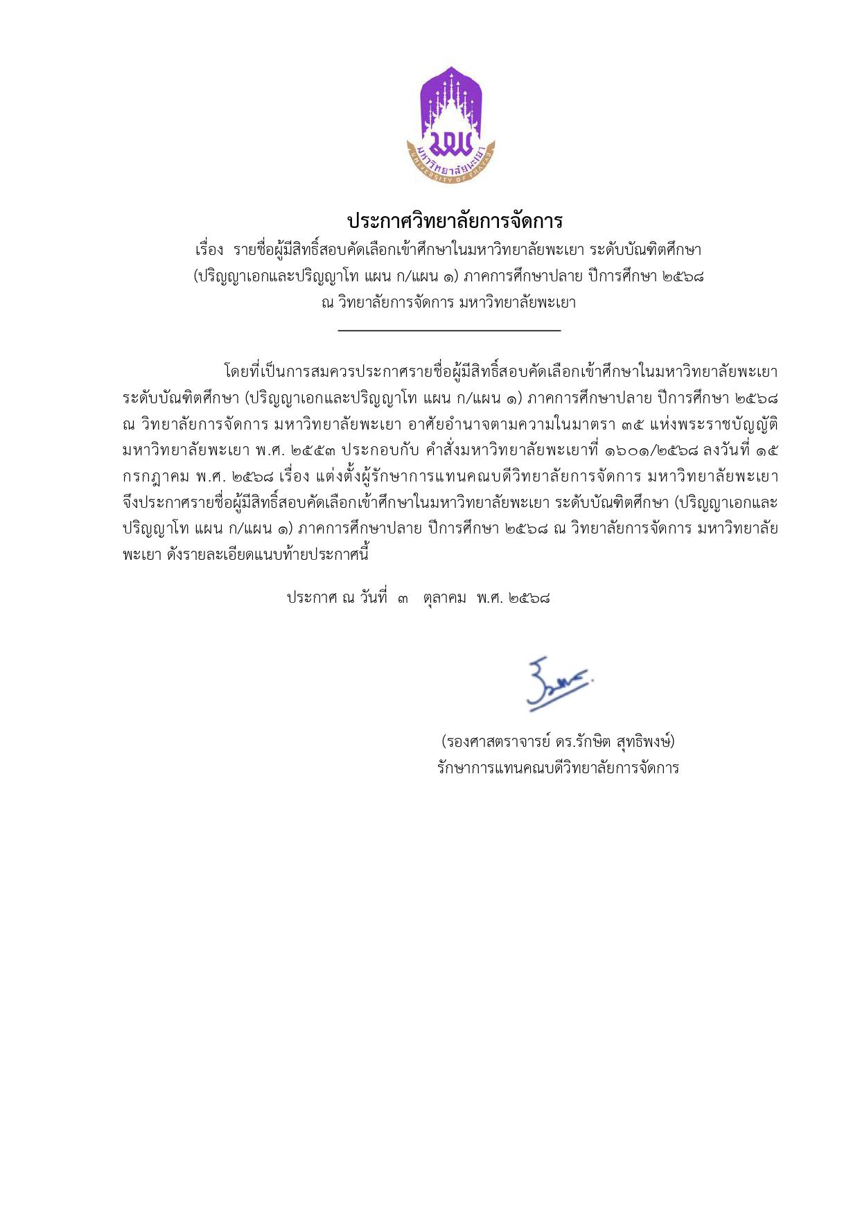 ประกาศวิทยาลัยการจัดการ เรื่อง รายชื่อผู้มีสิทธิ์สอบคัดเลือกเข้าศึกษาในมหาวิทยาลัยพะเยา ระดับบัณฑิตศึกษา (ปริญญาเอกและปริญญาโท แผน ก/แผน 1) ภาคการศึกษาปลาย ปีการศึกษา 2568 ณ วิทยาลัยการจัดการ มหาวิทยาลัยพะเยา