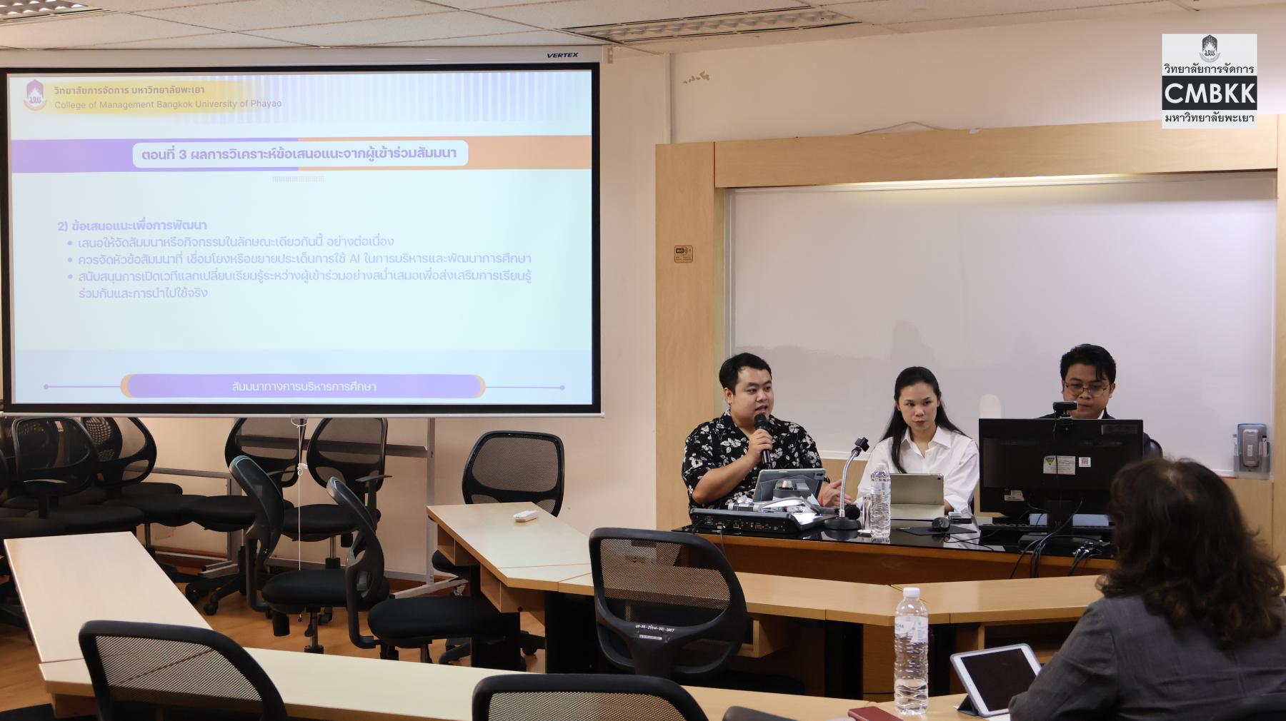 วันเสาร์ที่ 17 มกราคม 2569 เวลา 09.00 น. เป็นต้นไป วิทยาลัยการจัดการ มหาวิทยาลัยพะเยา หลักสูตรการศึกษามหาบัณฑิต สาขาวิชาการบริหารการศึกษา แผน ข นำเสนอรายงานการจัดสัมมนาทางการบริหารการศึกษา เรื่อง "การใช้เทคโนโลยีปัญญาประดิษฐ์ (AI) ในการบริหารสถานศึกษา : โอกาสหรือภัยคุกคาม" เมื่อวันที่ 20 ธันวาคม 2568 โดย นิสิตรุ่นเข้าศึกษาปีการศึกษา 2567 หลักสูตรการศึกษามหาบัณฑิต สาขาวิชาการบริหารการศึกษา แผน ข โดยมีคณาจารย์สาขาวิชาการบริหารการศึกษา เข้าร่วมรับฟังการนำเสนอรายงานดังกล่าว ณ ห้อง L808 วิทยาลัยการจัดการ มหาวิทยาลัยพะเยา อาคารเวฟเพลส ชั้น 8 กรุงเทพฯ