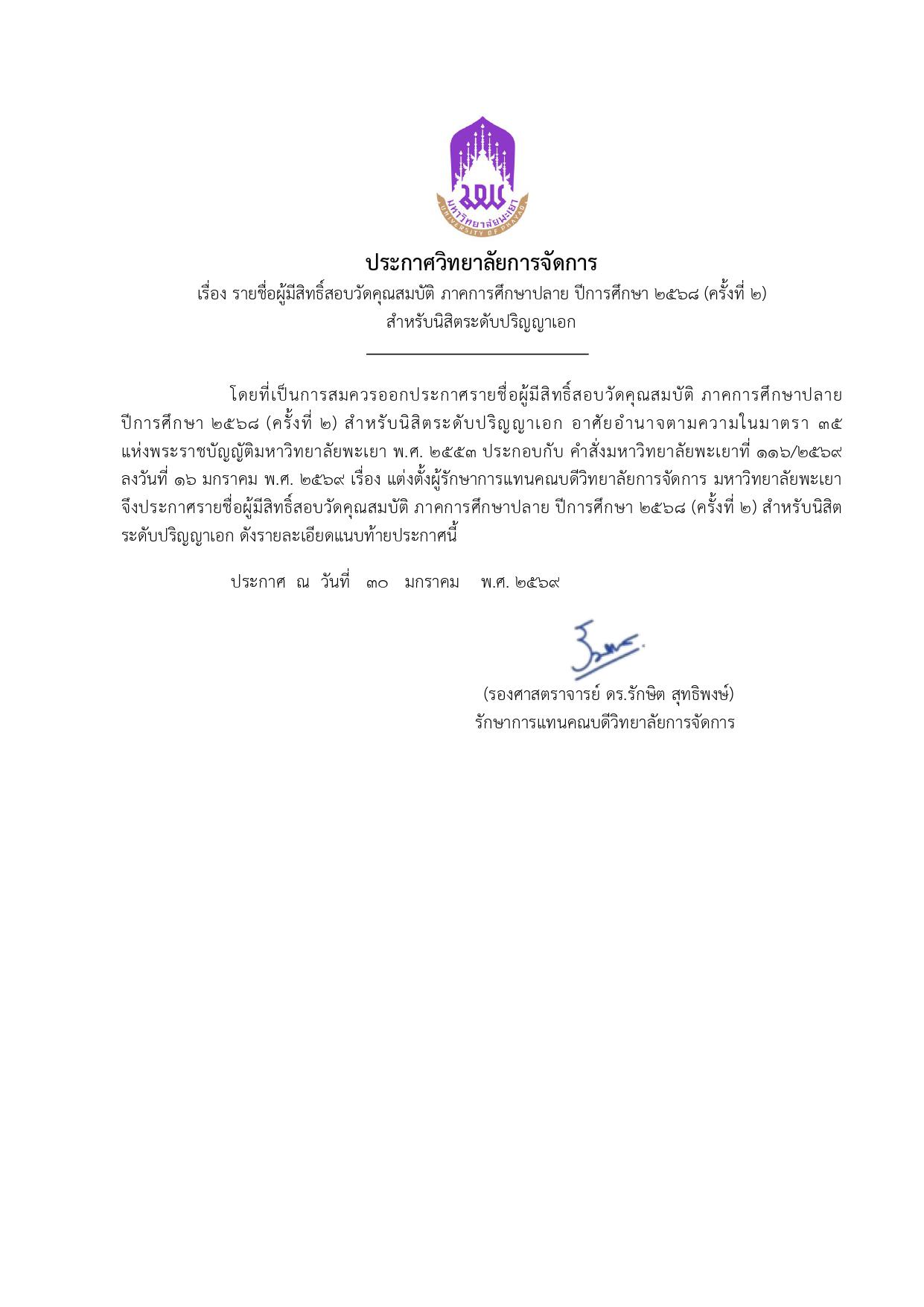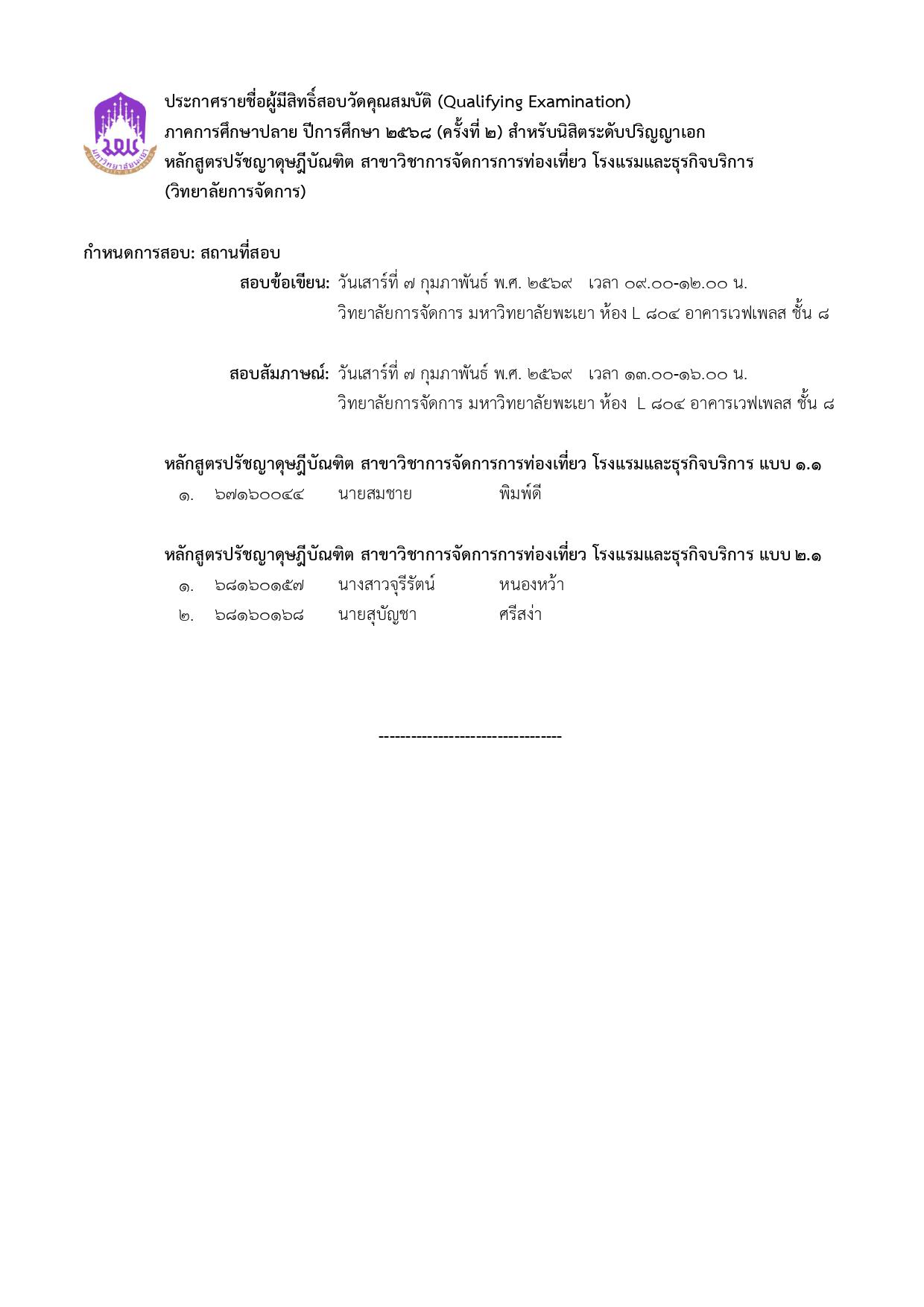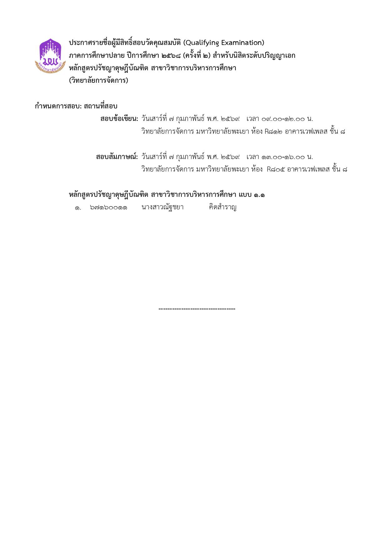 ประกาศวิทยาลัยการจัดการ เรื่อง รายชื่อผู้มีสิทธิ์สอบวัดคุณสมบัติ ภาคการศึกษาปลาย ปีการศึกษา 2568 (ครั้งที่ 2) สำหรับนิสิตระดับปริญญาเอก