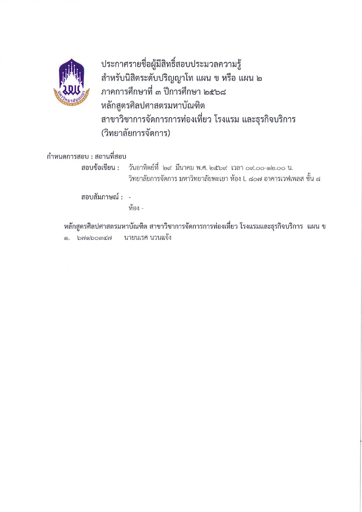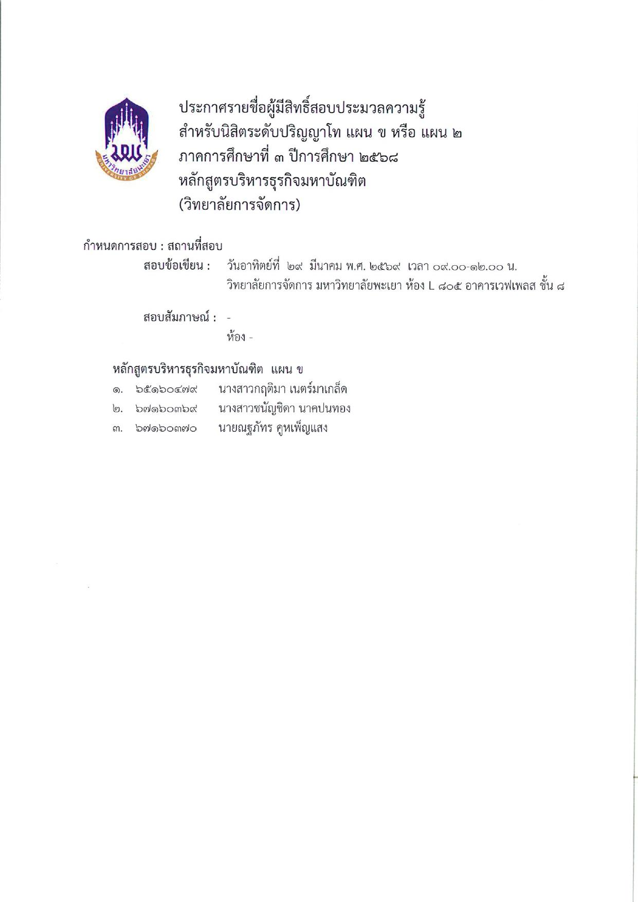 ประกาศวิทยาลัยการจัดการ เรื่อง รายชื่อผู้มีสิทธิ์สอบประมวลความรู้ สำหรับนิสิตระดับปริญญาโท แผน ข หรือ แผน 2 ภาคการศึกษาที่ 3 ปีการศึกษา 2568