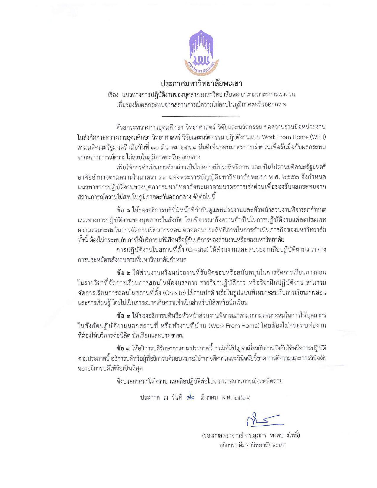 ด้วยประกาศมหาวิทยาลัยพะเยา เรื่อง แนวทางการปฏิบัติงานของบุคลากรมหาวิทยาลัยพะเยา ตามมาตรการเร่งด่วน เพื่อรองรับผลกระทบจากสถานการณ์ความไม่สงบในภูมิภาคตะวันออกกลาง ลงวันที่ 12 มีนาคม 2569 กำหนดให้หัวหน้าส่วนงานพิจารณากำหนดแนวทางการปฏิบัติงานของบุคลากรในสังกัด โดยพิจารณาถึงความจำเป็นในการปฏิบัติงานแต่ละประเภท ความเหมาะสมในการจัดการเรียนการสอน ตลอดจนประสิทธิภาพในการดำเนินการภารกิจของมหาวิทยาลัย ทั้งนี้ ต้องไม่กระทบกับการให้บริการแก่นิสิตหรือผู้รับบริการของส่วนงานหรือของมหาวิทยาลัย