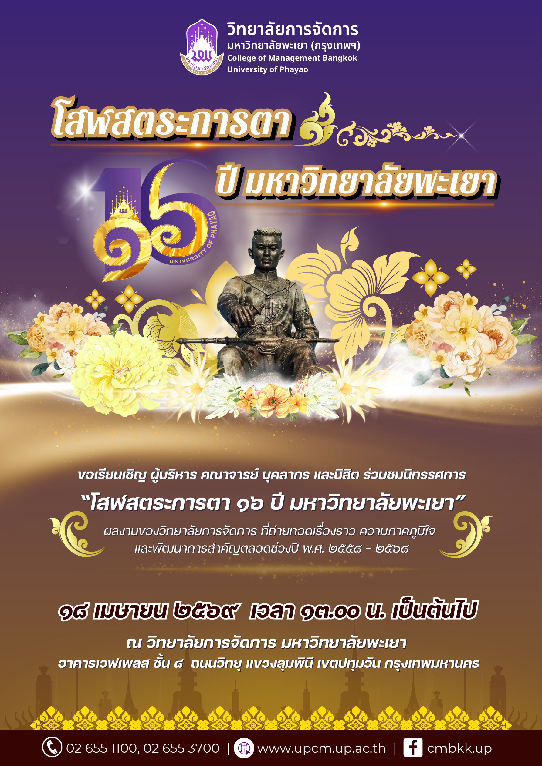 ขอเชิญร่วมเป็นส่วนหนึ่งแห่งความภาคภูมิใจ 🎉💜💛 ร่วมชมนิทรรศการ “โสฬสตระการตา 16 ปี มหาวิทยาลัยพะเยา”