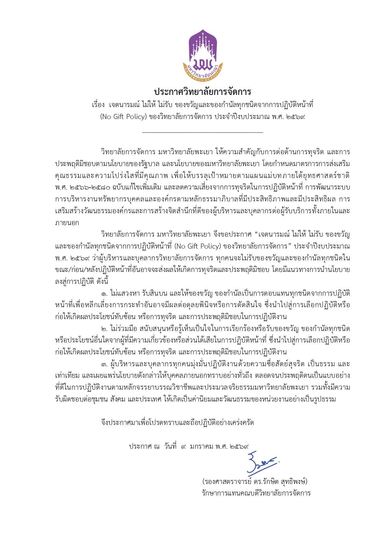 ประกาศวิทยาลัยการจัดการ เรื่อง เจตนารมณ์ ไม่ให้ ไม่รับ ของขวัญและของกำนัลทุกชนิดจากการปฏิบัติหน้าที่ (No Gift Policy) ของวิทยาลัยการจัดการ ประจำปีงบประมาณ พ.ศ. 2569