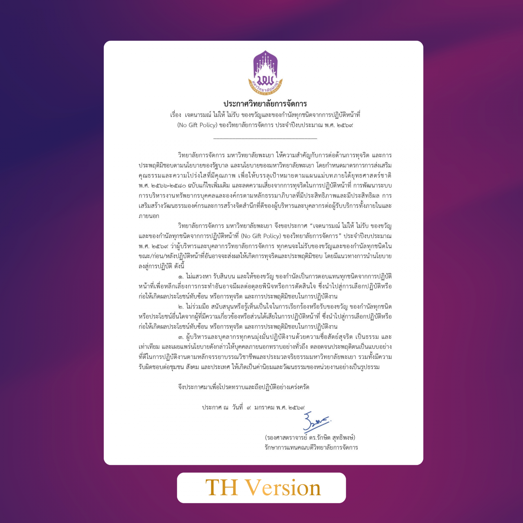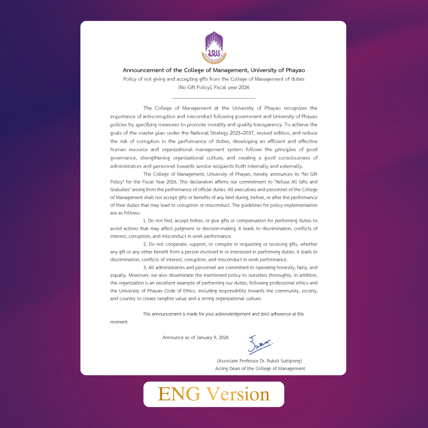 ประกาศวิทยาลัยการจัดการ เรื่อง เจตนารมณ์ ไม่ให้ ไม่รับ ของขวัญและของกำนัลทุกชนิด จากการปฏิบัติหน้าที่ (No Gift Policy) ประจำปีงบประมาณ พ.ศ. 2569