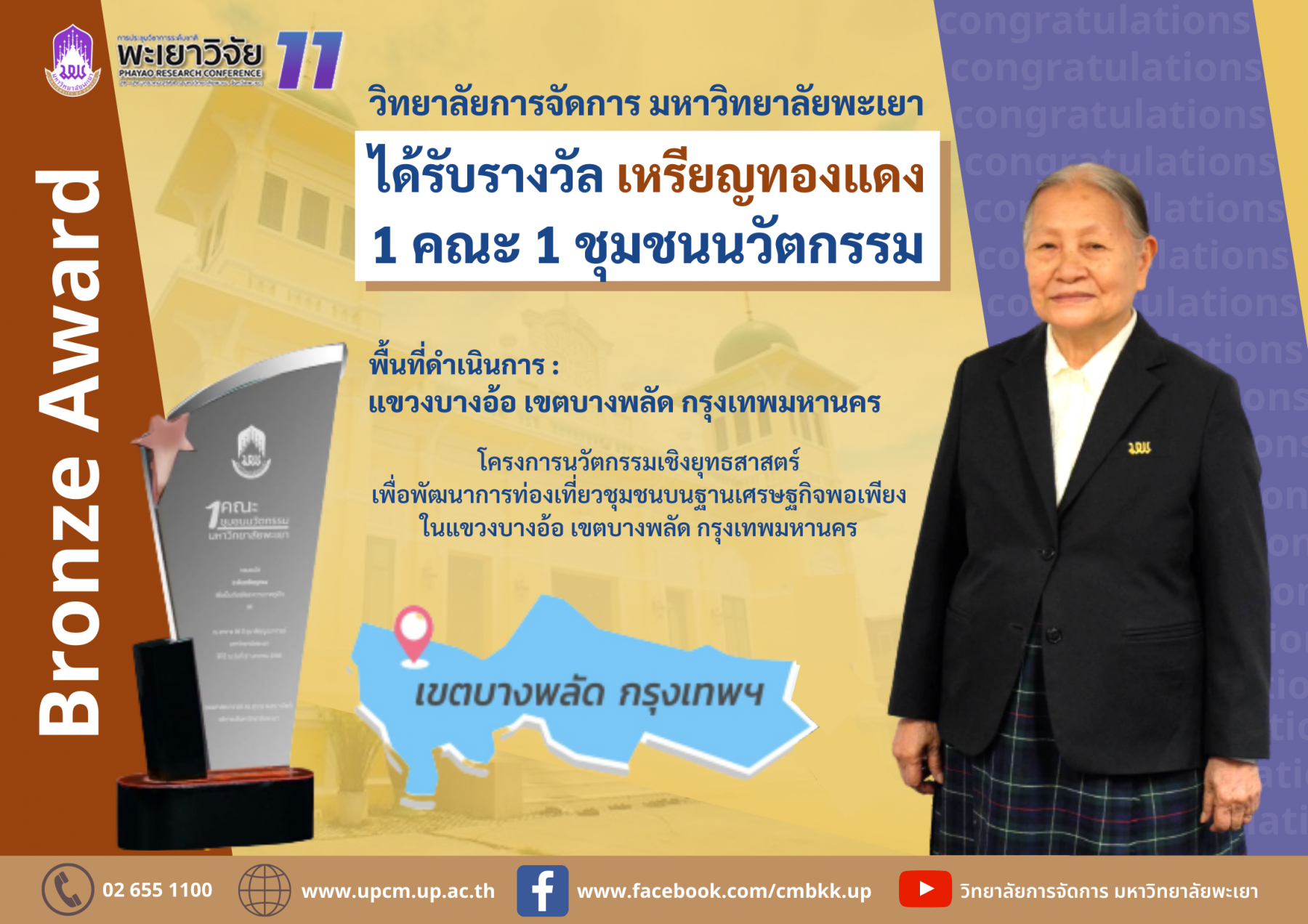 วิทยาลัยการจัดการ มหาวิทยาลัยพะเยา ได้รับรางวัล เหรียญทองแดง 🏆 1 คณะ 1 ชุมชนนวัตกรรม ในงานการประชุมวิชาการระดับชาติพะเยาวิจัย ครั้งที่ 11💛💜